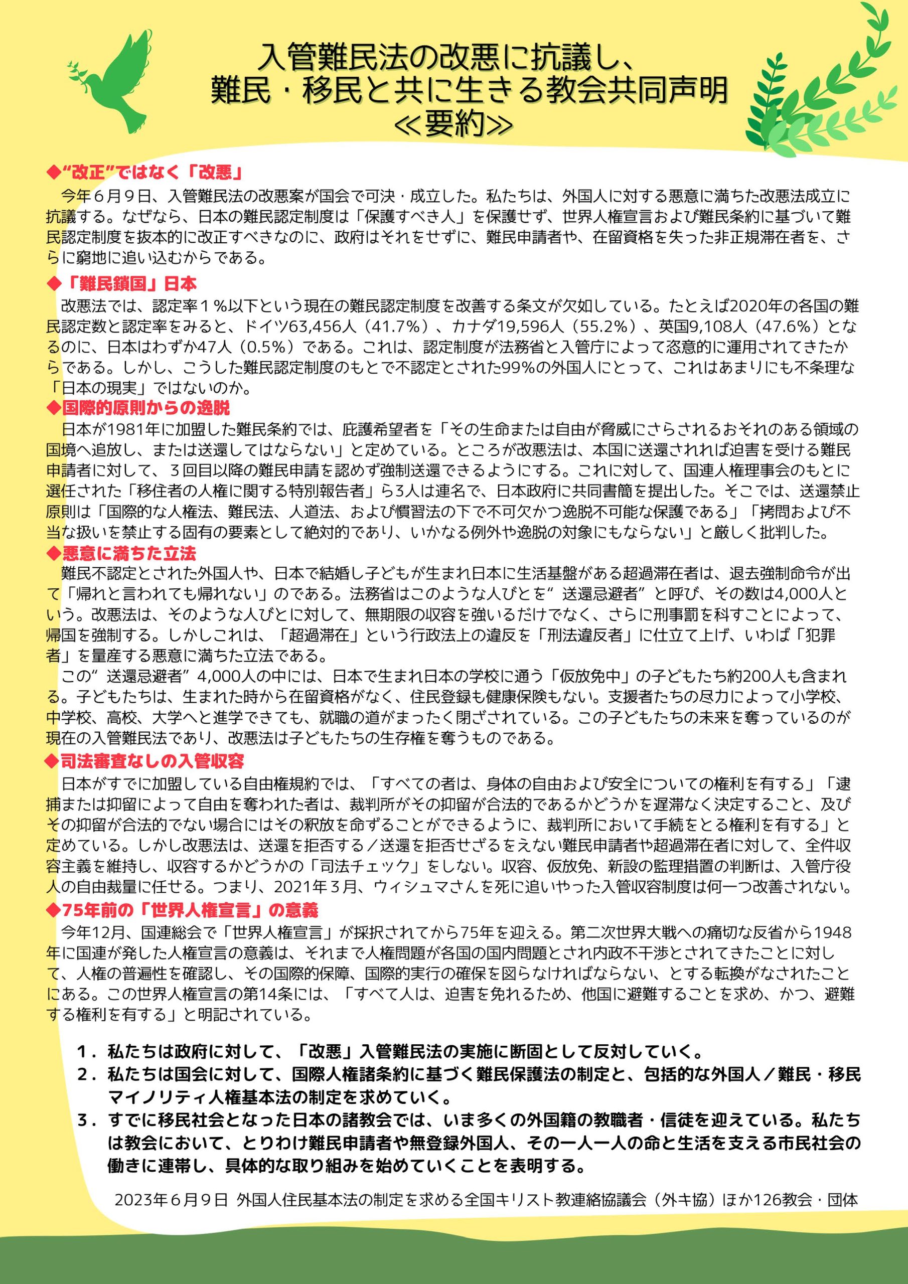 ※入管難民法の改悪に抗議し、難民・移民と共に生きる教会共同声明<要約>はこちらからダウンロードできます。